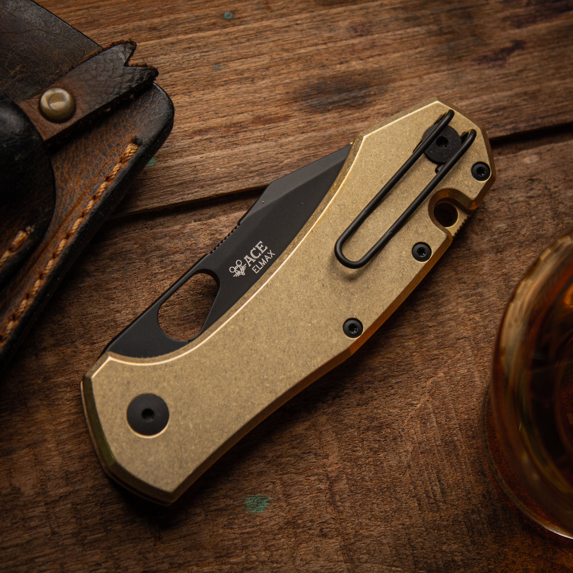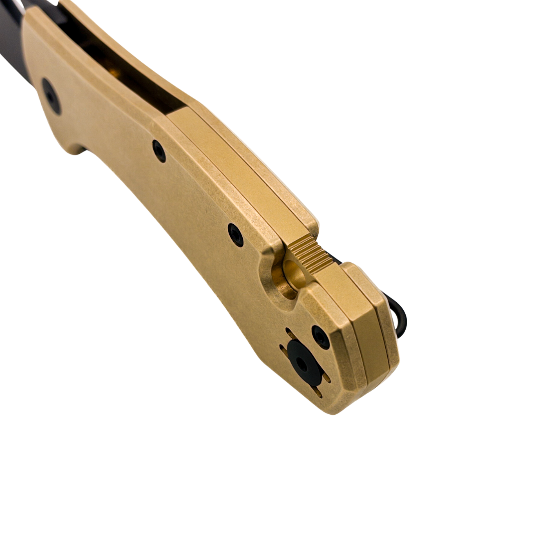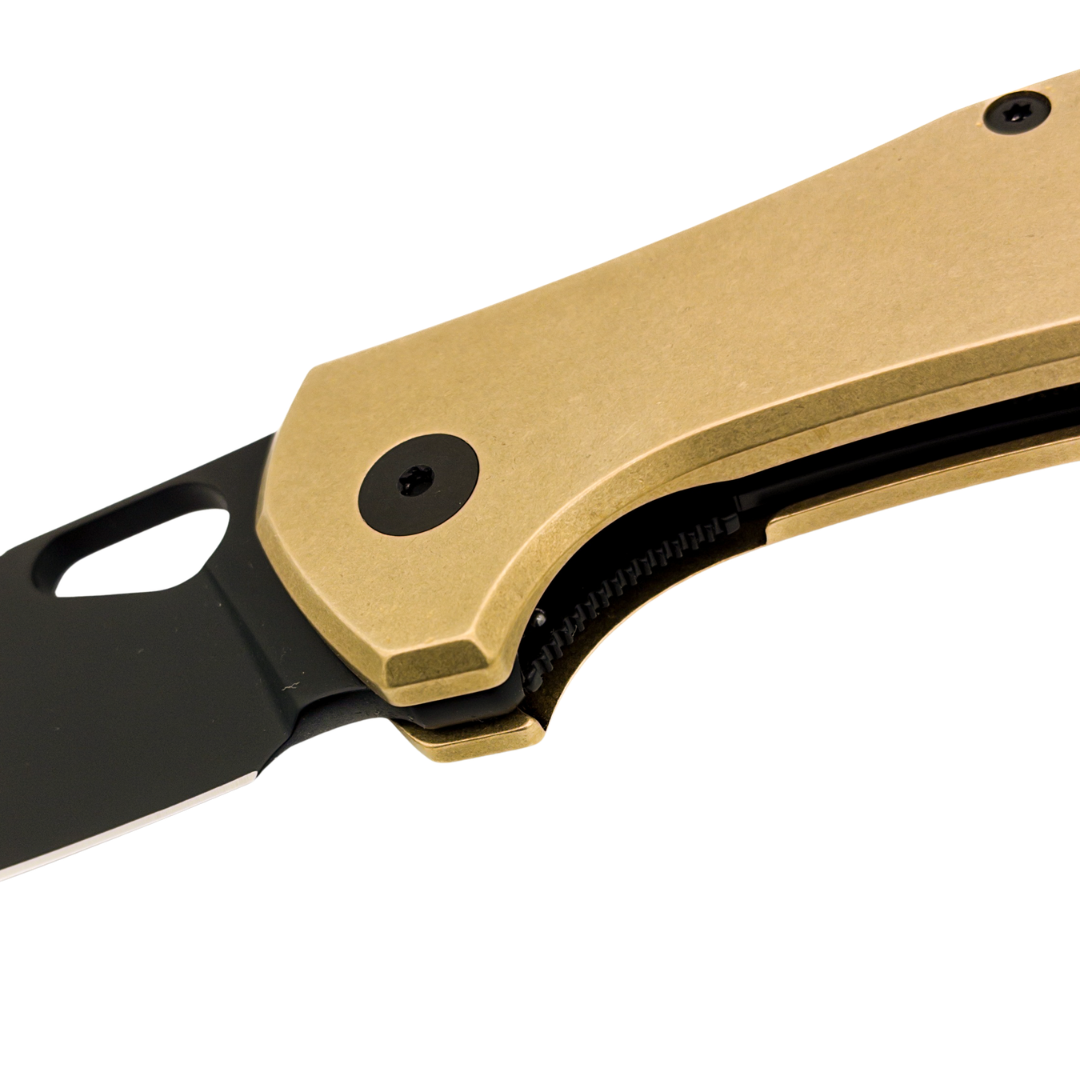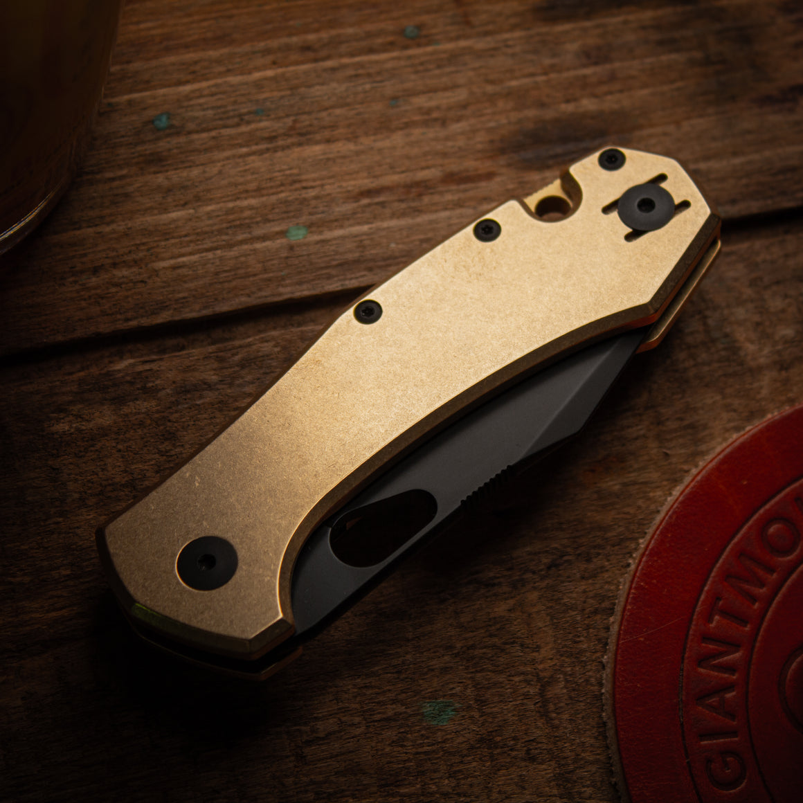This particular edition brings a new weight and character to the design. The Elmax blade is treated with a PVD finish, providing a dark, resilient edge that contrasts beautifully with the flat brass scales. Over time, the brass scales and matching brass backspacer will develop a unique patina, reflecting the history of how and where you use it.