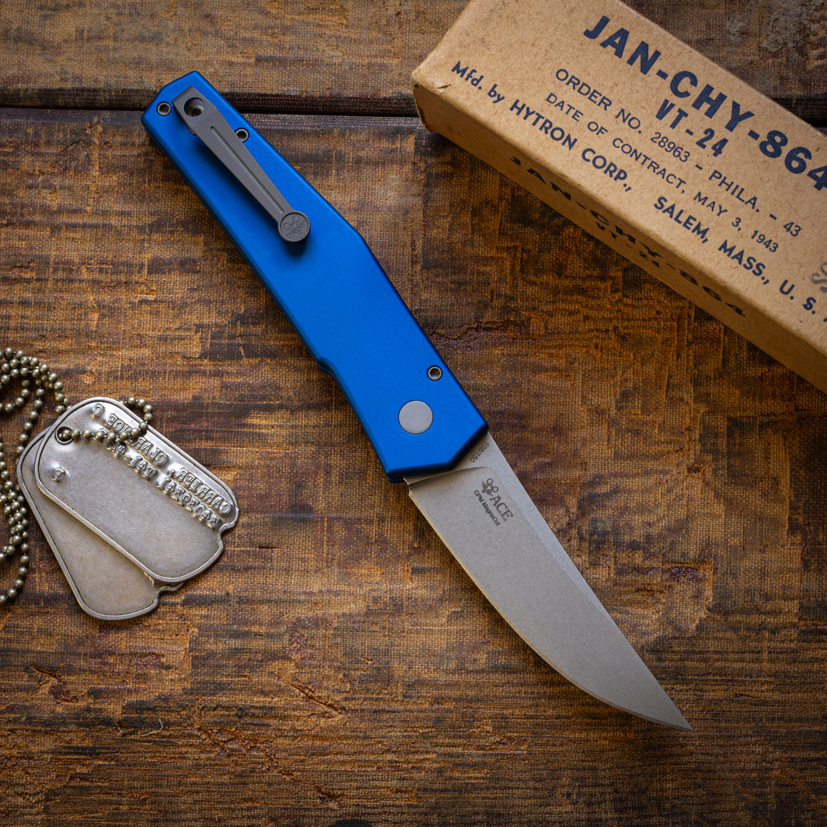 The ACE Elmer is built in the spirit of that resolve. It takes the clean attitude of the Clyde, scales it with purpose, and channels the capability of the GMX into an automatic that feels ready the moment you touch it. Our partnership with ProTech brings this design to life with crisp geometry, fast action, and American craftsmanship you can feel in every lock, line, and contour. This edition adds a cool, confident presence that suits the knife’s character, offering a finish that feels deliberate rather than decorative.