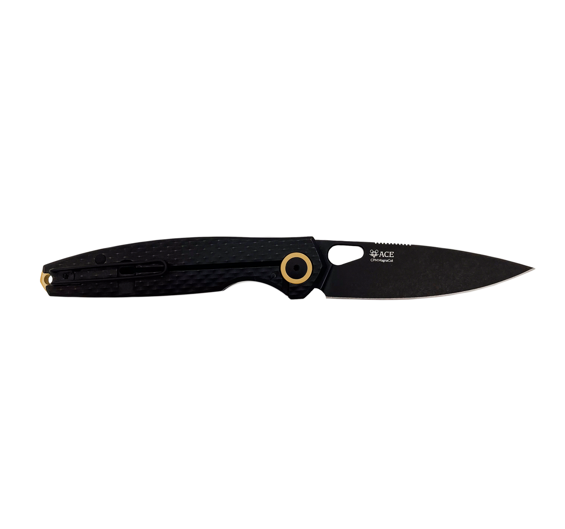 Just a short drive from our headquarters lies REO Town, the historic heart of Lansing where the REO Motor Car Company first began its legacy of American industrial innovation. The ACE REO - Black & Brass is a direct tribute to that heritage, designed to embody the same focus on quality and craftsmanship that once defined the golden age of automotive manufacturing. This version takes the iconic ACE REO silhouette and cloaks it in a deep Black PVD finish across both the milled Titanium scales and the premium CPM-Magnacut blade, creating a look that is as enduring as the history it honors.