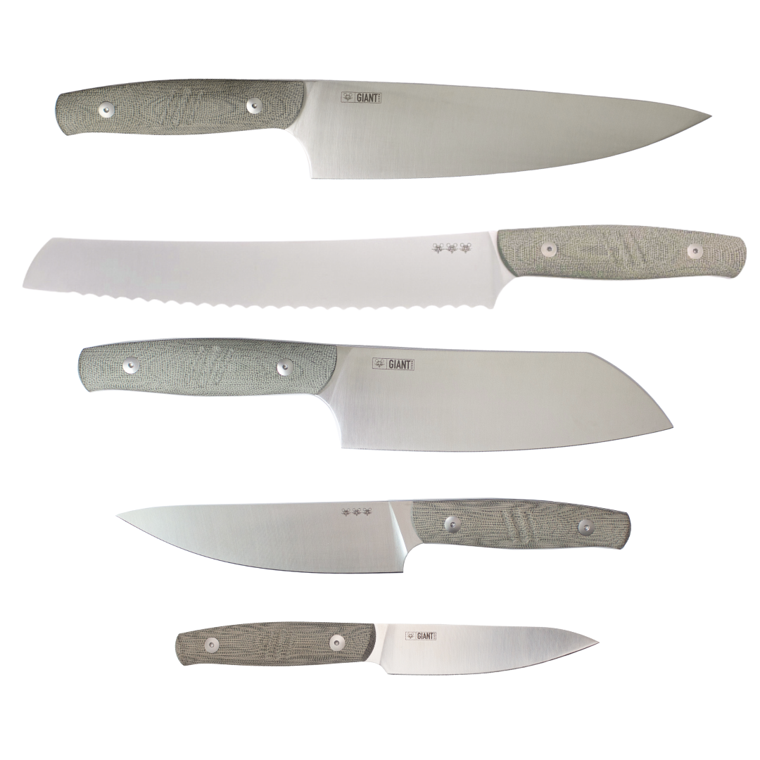 With the GM Kitchen Knife Set, we’ve aimed for nothing less than culinary cutlery excellence. This selection of knives was built to thrive through every step of your recipe, crafted with the attention to quality GiantMouse is known for. Each the perfect balance of aesthetics and utility, these tools don't just look impressive, they perform at exceptional levels, making them a prized addition to any cooking arsenal.