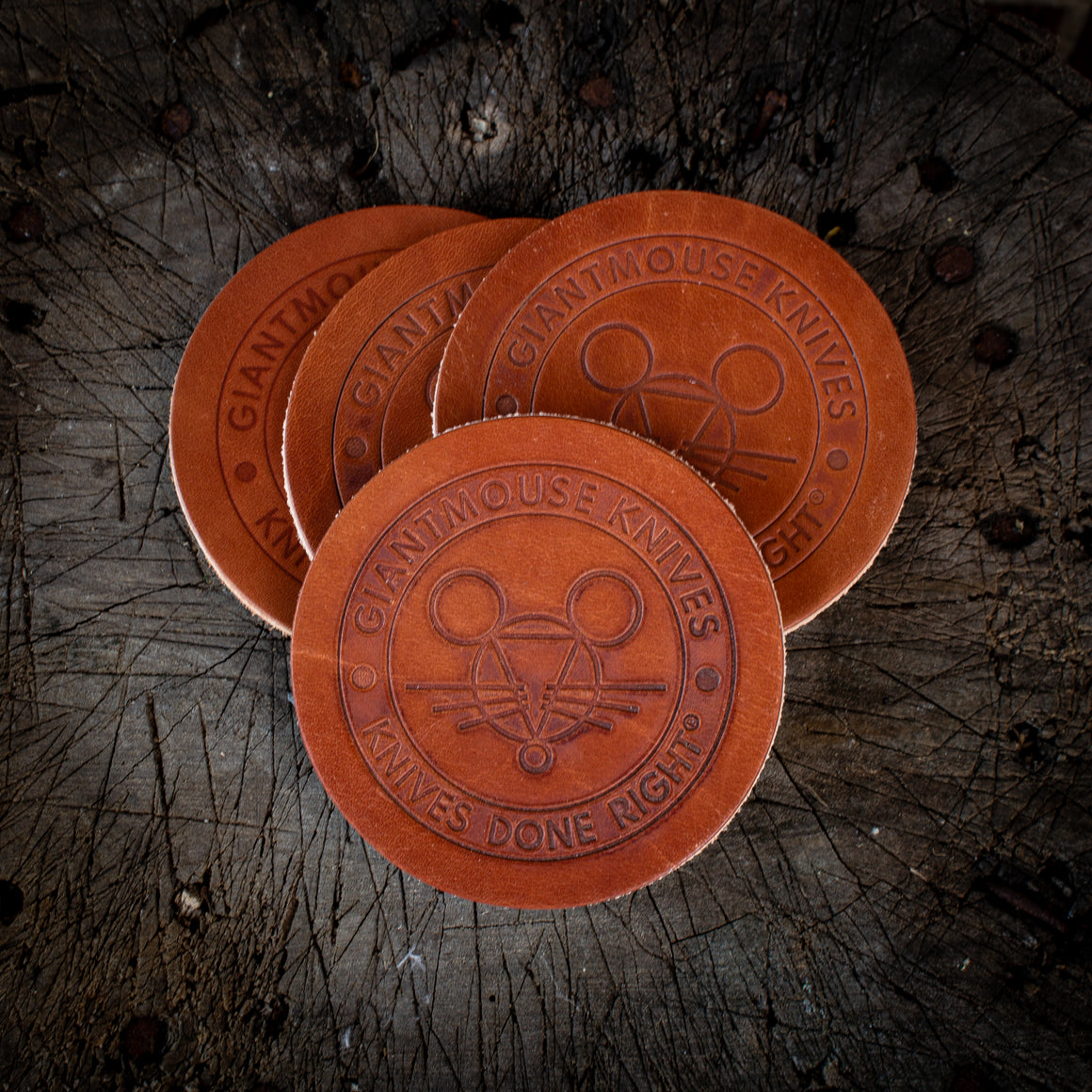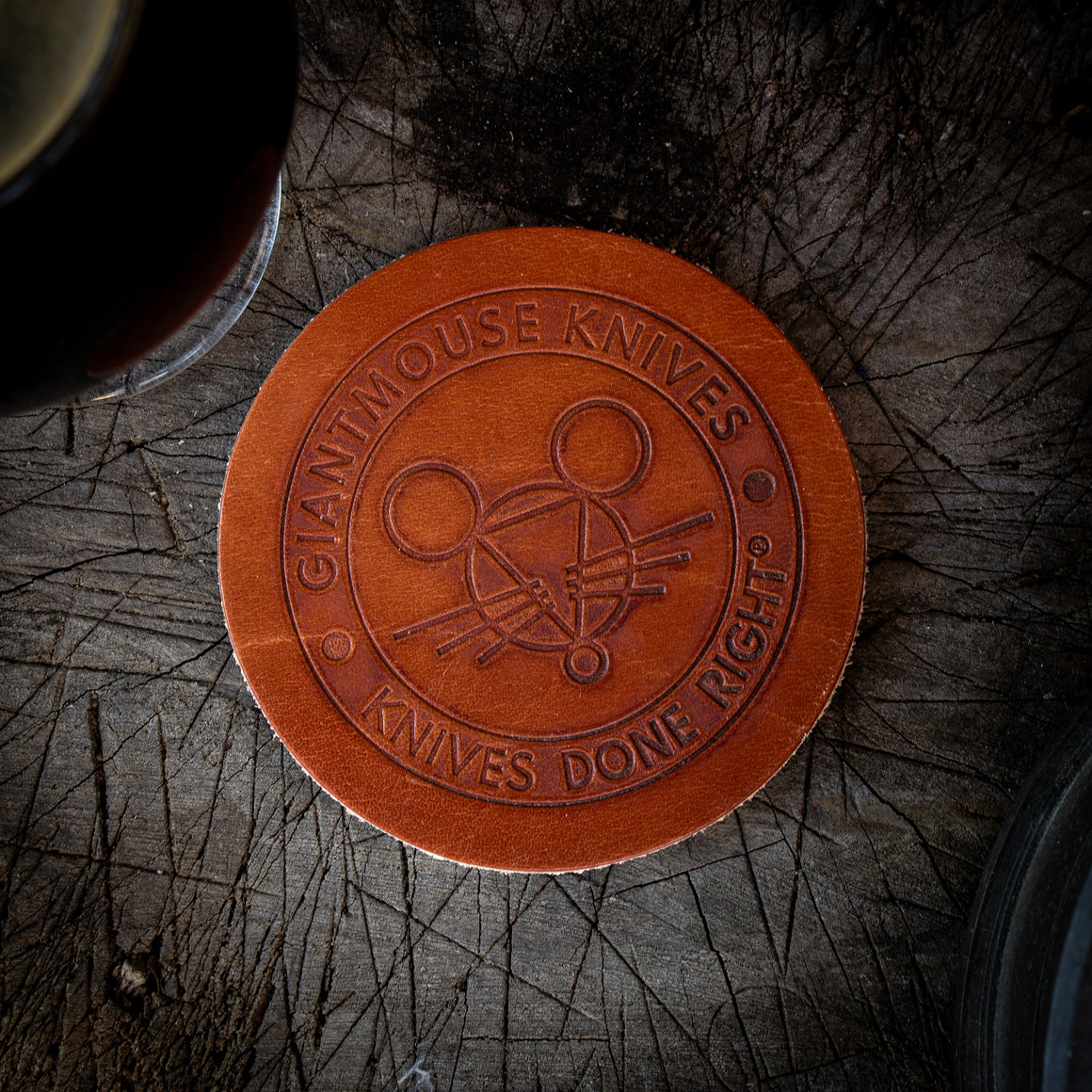 Every detail tells a story with the GiantMouse Leather Coaster Set. This set of four coasters are made from premium leather sourced from Wickett & Craig, a tannery with over a century of tradition crafting hides that age beautifully while standing up to real use. Each cut piece is then embossed by Rose Anvil, artisans who bring decades of hand-stamped precision to every design. The classic GiantMouse pirate logo sits at the center, encircled by “GiantMouse Knives” and “Knives Done Right,” a nod to the care and craftsmanship that goes into everything we make. This set isn’t just about protecting surfaces—it’s about carrying the spirit of legacy, skill, and attention to detail from three of the most respected names in their craft into your home.