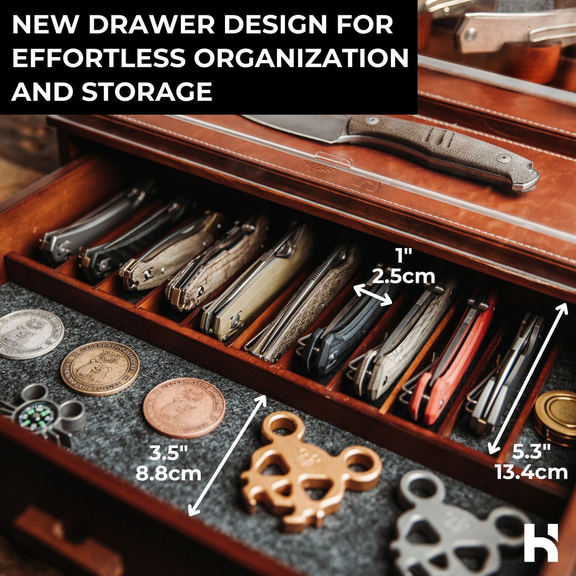 Drawer Layout: Reimagined drawer built to fit most GiantMouse knives, with smooth runners and felt-lined compartments for EDC gear, accessories, and additional knives.